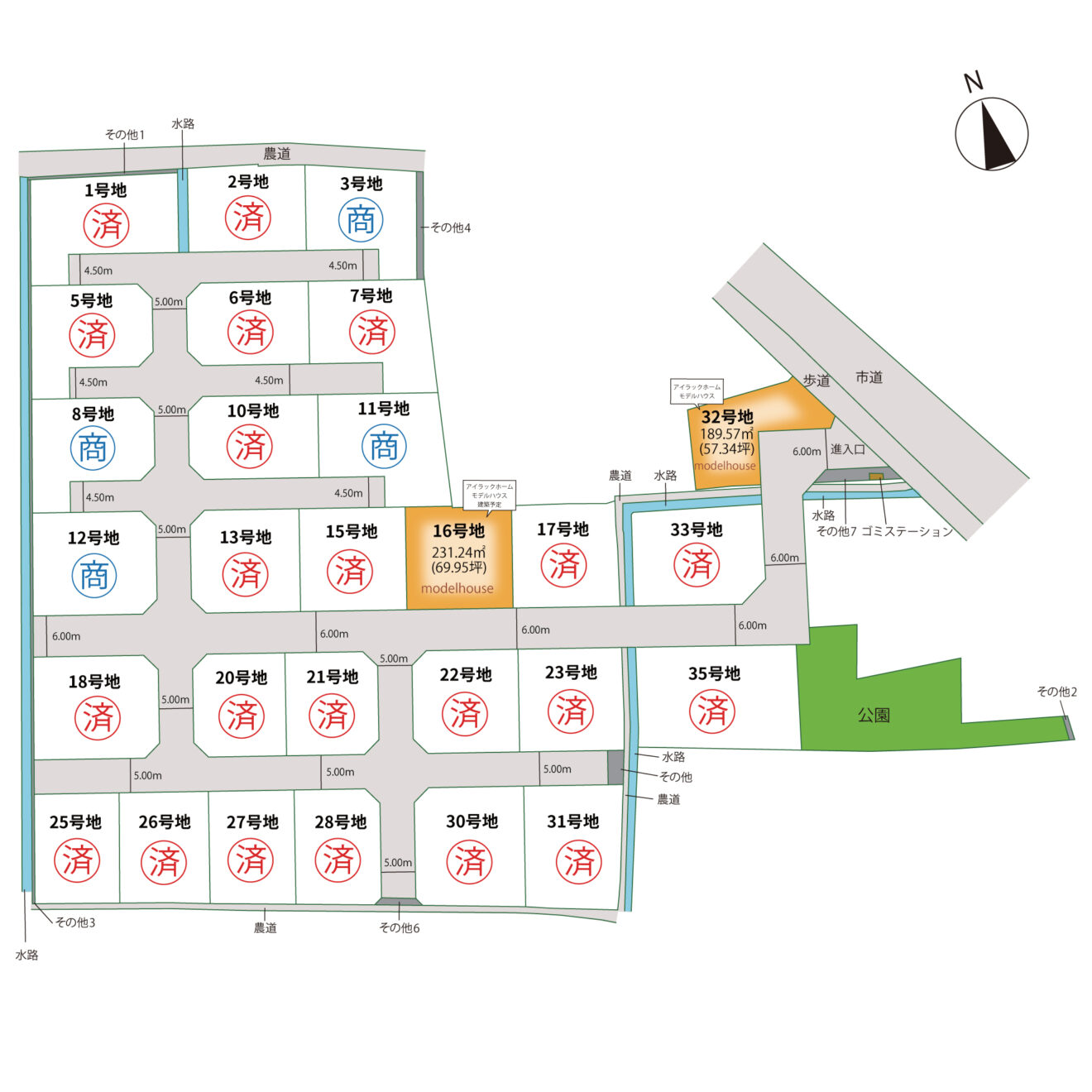 | 道路 | 進入口:東側 ( 市道 ) 約 11.78 m ( 歩道含む ) 分譲地内:( 開発道路 ) 約 4.50 m~ 6.00 m ※寄附予定 |