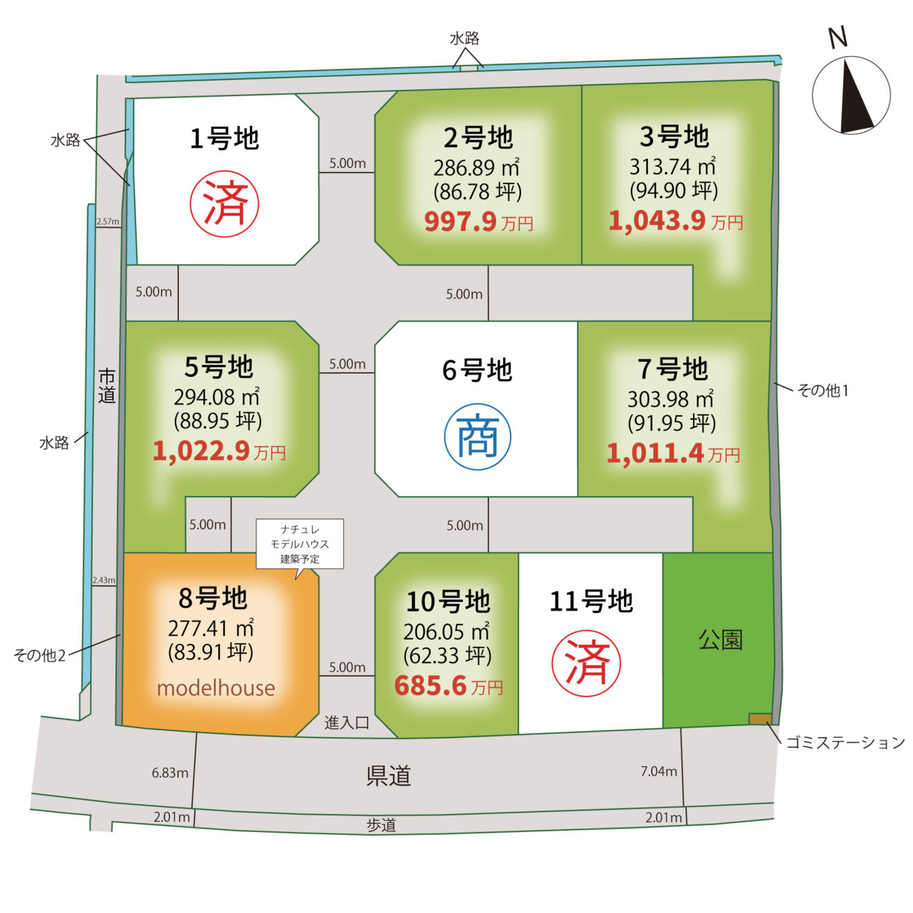 分譲地内:( 開発道路 ) 約 5.00 m ※寄附予定