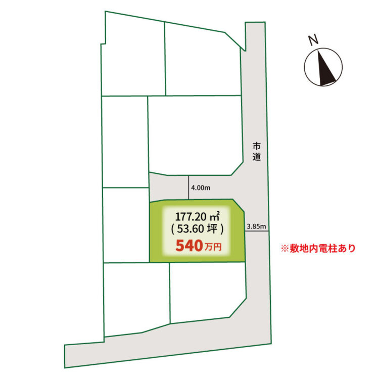 | 道路 | 進入口:東側 ( 市道 ) 約 3.85m 北側 ( 開発道路 ) 約 4.00m |