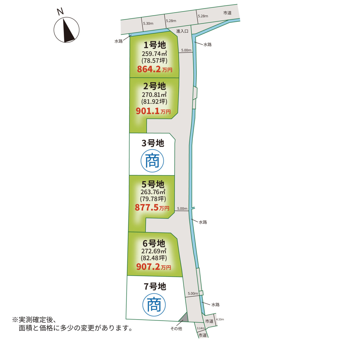 道路 | 進入口:北側 ( 市道 ) 約 5.30 m・南側 ( 市道 ) 約 4.33 m 分譲地内:( 開発道路・市道 ) 約 5.00 m ※道路寄附予定 |