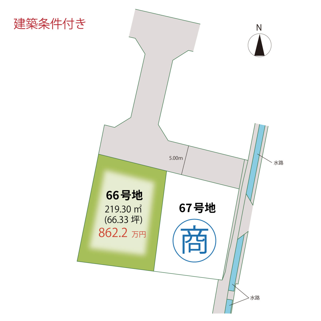 | 道路 | 進入口:( 北側:開発道路 ) 約 5.00m 分譲地内:( 位置指定道路 ) 約 5.00m |