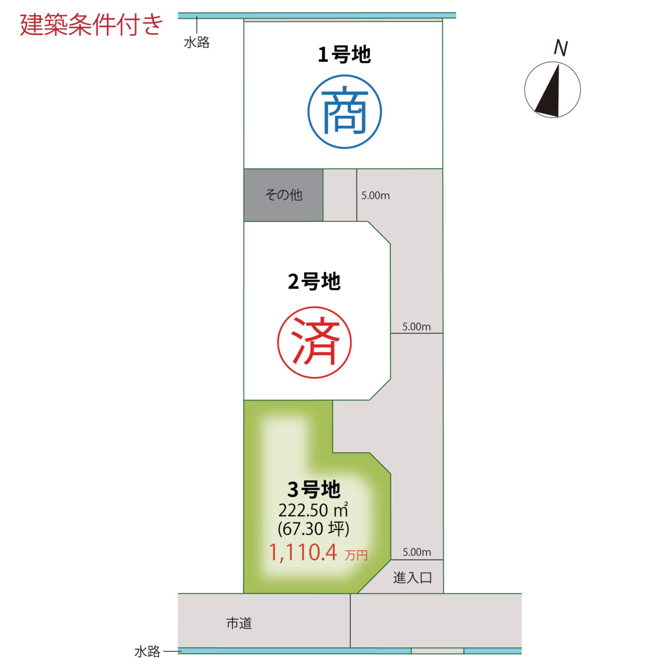 分譲地内:( 開発道路 ) 約 5.00 m ※寄附予定