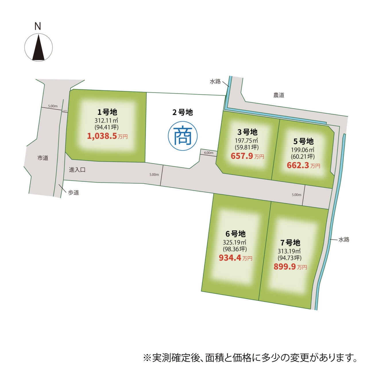 | 道路 | 進入口:西側 ( 市道 ) 歩道含む 約 6.47 m 分譲地内:( 開発道路 ) 約 4 ~ 5 m ※寄附予定 |