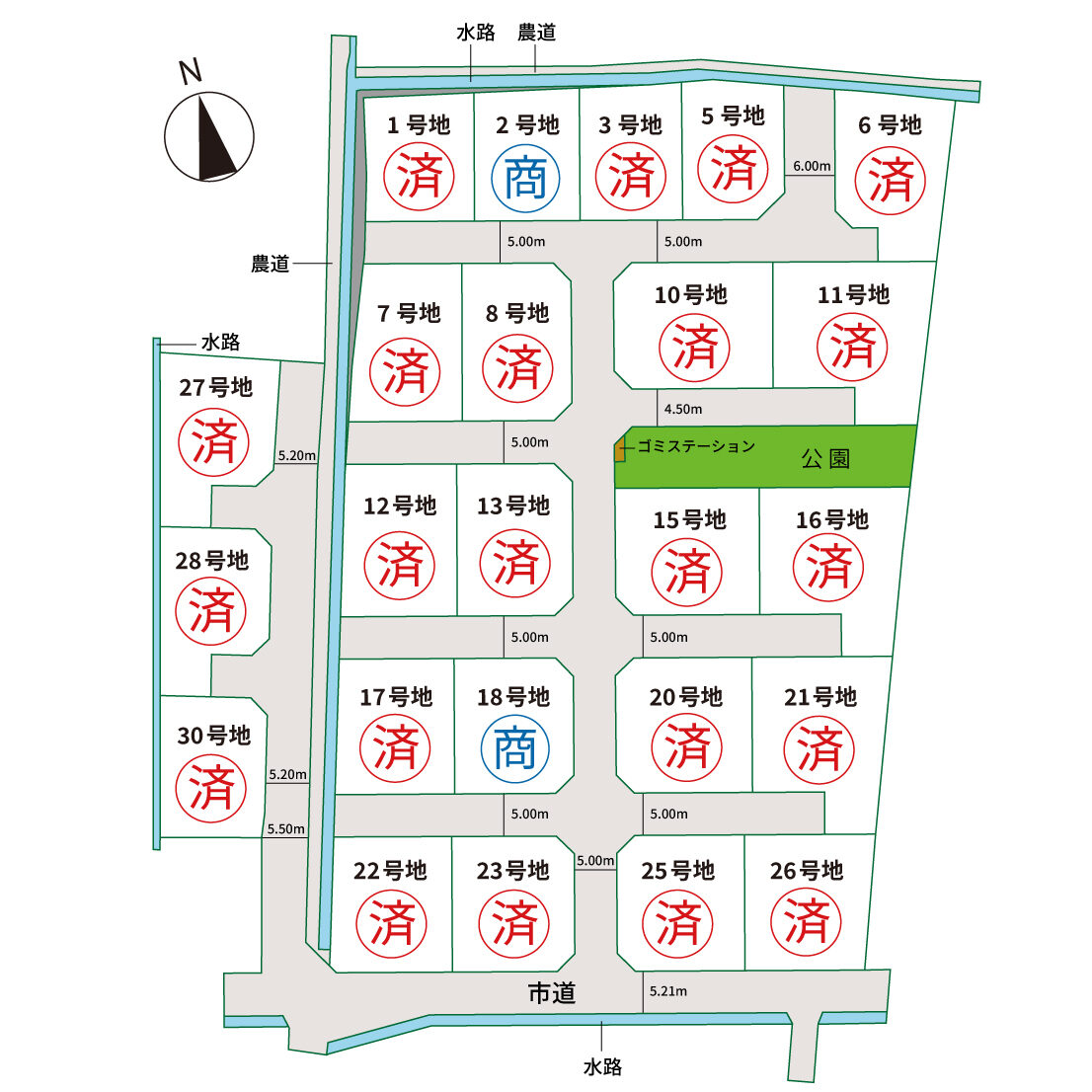| 道路 | 進 入 口 :南側 (市道) 約5.21m 分譲地内:(開発道路) 約4.50m~6.00m |