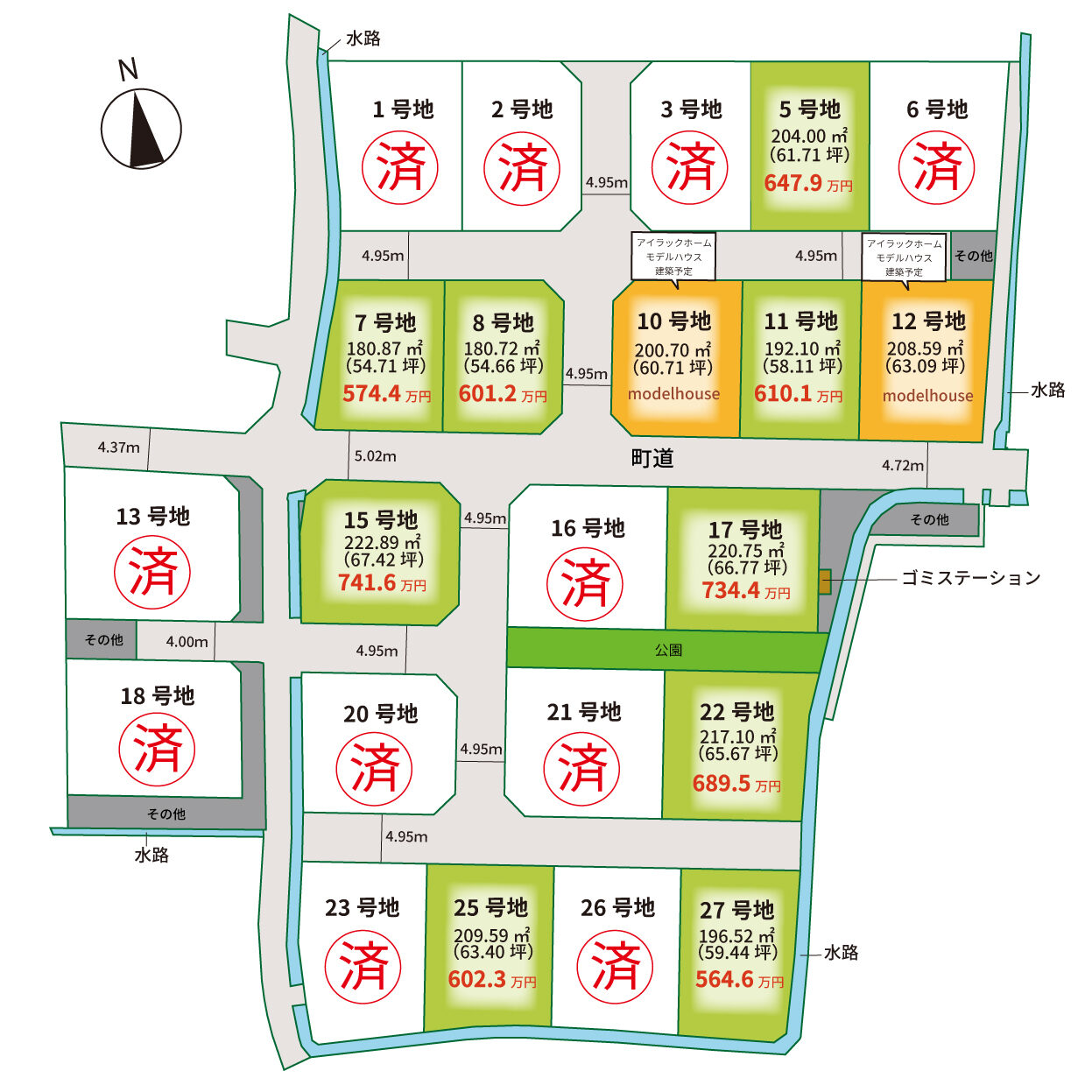 道路 | 進入口:1~12号地 (南側:町道 約5m)・13~27号地 (北側:町道 約5m) 分譲地内:(開発道路)約4.00m~4.95m |