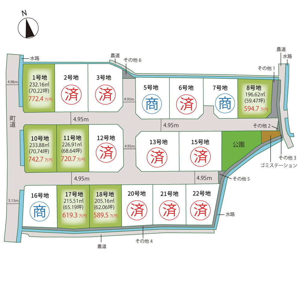 | 道路 | 進入口:西側(町道)約 4.98~5.13m・東側(法外道路)約 5m 分譲地内:(開発道路)約 4.95m ※寄附不可 |