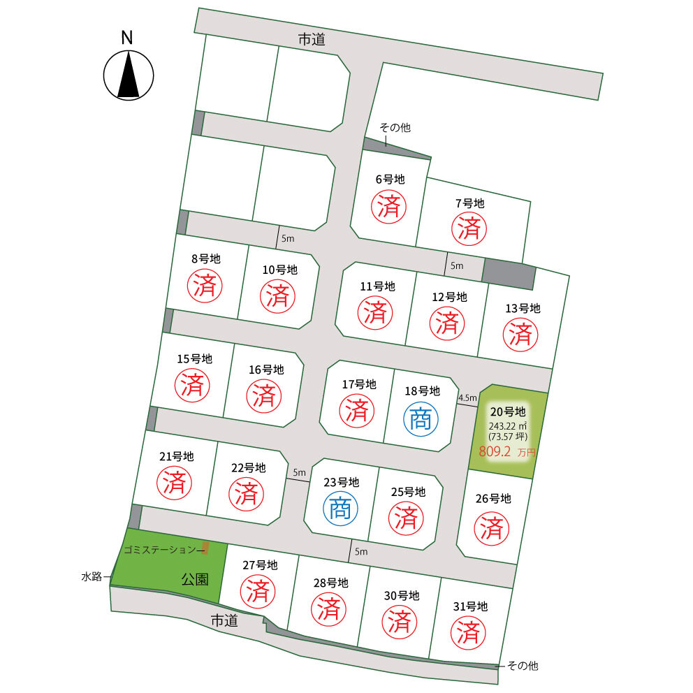 | 道路 | 進入口(北側:市道 約5.7m) 分譲地内(開発道路:約4.5m~約5m) |
