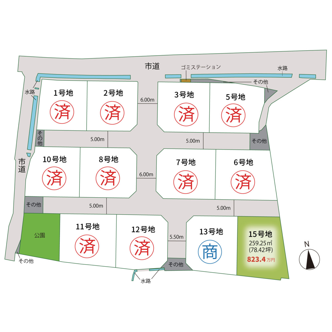 | 道路 | 進入口:北側(市道)約 5.50m 分譲地内:(開発道路)約 5~6m ※寄附予定 |