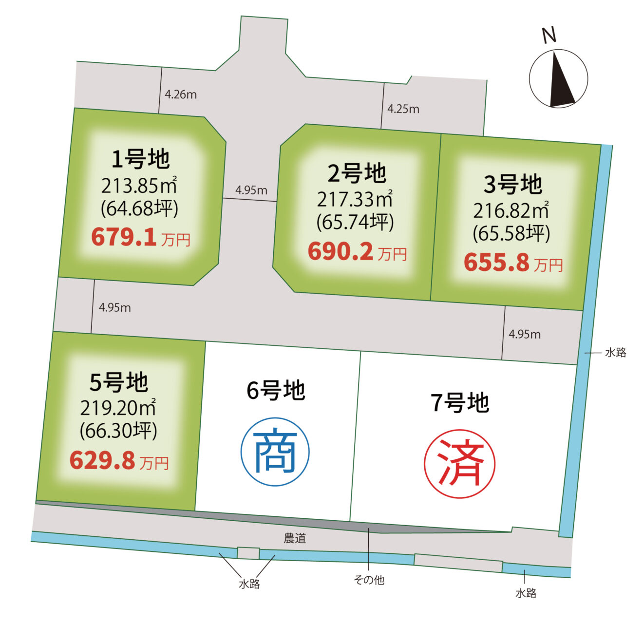 | 道路 | 進入口:北側・西側 ( 位置指定道路 ) 約 4.25 m~4.95 m 分譲地内:( 開発道路 ) 約 4.95 m |